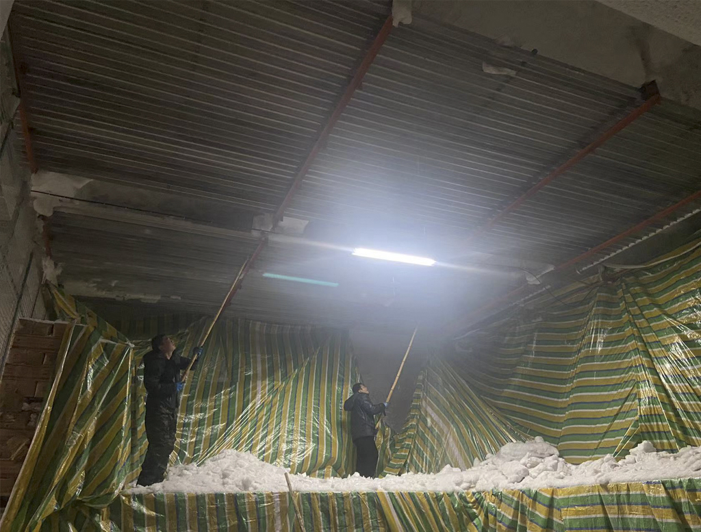 除冰、除霜工作開(kāi)始前,設(shè)備人員對(duì)冷庫(kù)設(shè)備進(jìn)行全面檢查,設(shè)置警示標(biāo)志,確保除冰、除霜設(shè)備運(yùn)轉(zhuǎn)正常及作業(yè)人員的人身安全。除霜工作系低溫作業(yè),雖然面臨著手僵直、拿不穩(wěn)、冰面滑、站不穩(wěn)等困難,但是中凱作業(yè)員工一干就是6、7個(gè)小時(shí)。