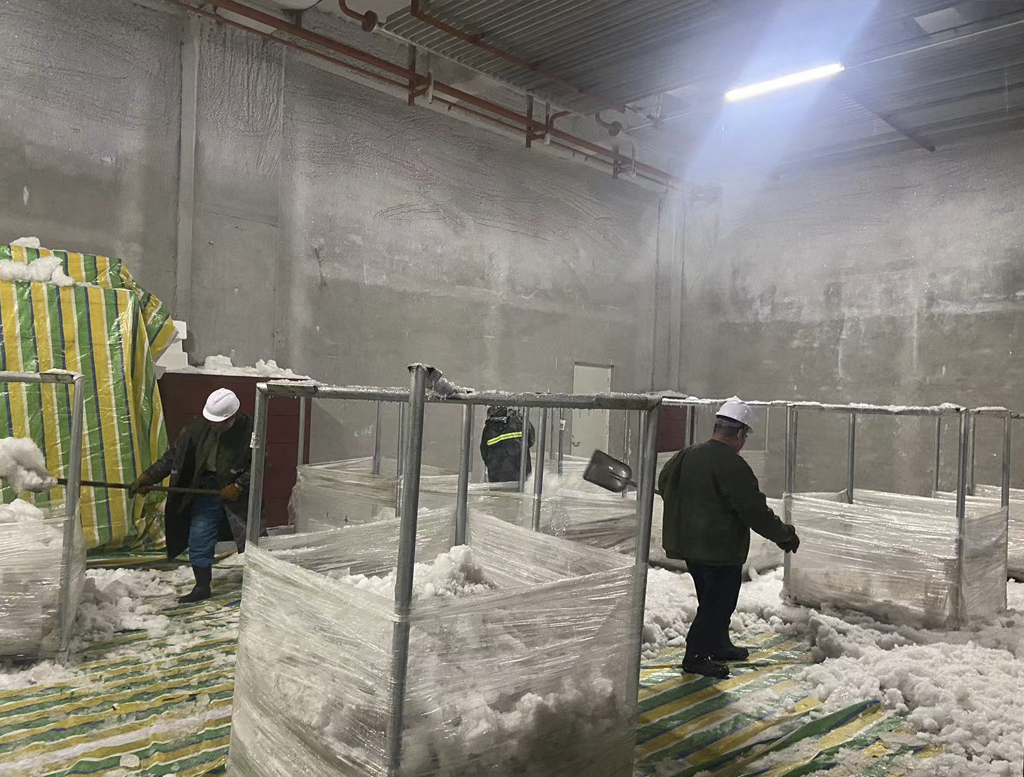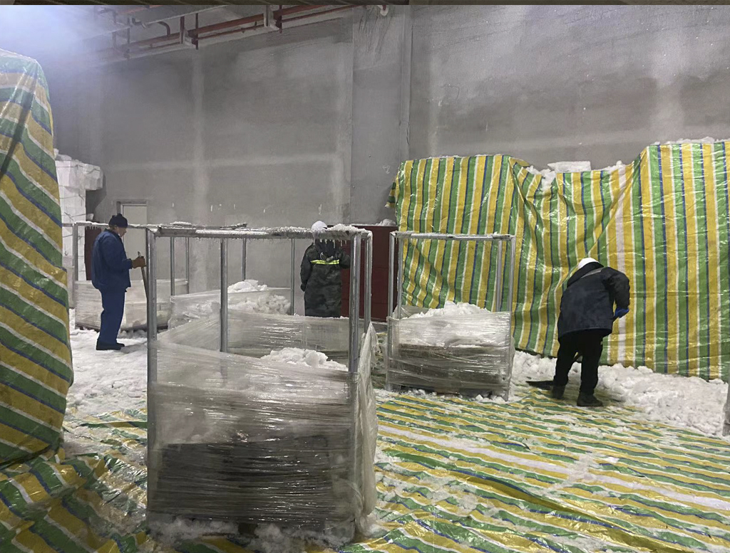中凱智慧冷鏈物流園內(nèi)中凱冷庫(kù)作為集低溫庫(kù)、高溫庫(kù)、恒溫庫(kù)和大型裝卸平臺(tái)等功能為一體的綜合性冷庫(kù),專注農(nóng)產(chǎn)品冷鏈存儲(chǔ)及短期周轉(zhuǎn)存儲(chǔ)。為使冷庫(kù)保持穩(wěn)定庫(kù)溫,確保貨物儲(chǔ)存品質(zhì),降低設(shè)備能耗,中凱冷庫(kù)負(fù)責(zé)人組織作業(yè)人員、設(shè)備人員、協(xié)調(diào)搬運(yùn),共同開(kāi)展A103冷庫(kù)除冰、除霜工作。