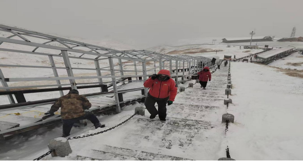 據(jù)了解,公司充分考量冬季長白山主峰風大雪大的極端氣候特點,避雪長廊最終確定采用穩(wěn)固的鋼架結(jié)構(gòu),搭配透明且韌性極強的耐力板,工程總長900米,寬2米,高約3米。該工程除焊接、切割等專業(yè)性較強的工序外,扛管、釘板等基礎(chǔ)工作均由一線員工完成。如何把近90噸施工材料運送到1442級臺階沿線是施工最大難題。受地理環(huán)境的限制,最終只能選擇人力運送,以每人50級臺階進行接力,把數(shù)十斤,甚至百斤重的鋼管和耐力板扛送到指定沿線施工點,他們每天接力往返近百次。凜冽寒風中,員工們肩頭的壓痕、凍紅的雙手,都化作了工程推進的堅實印記。